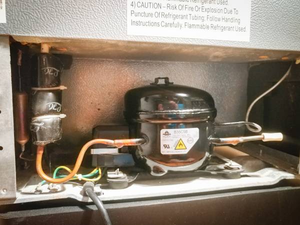 The back Cardboard plate is missing from the fridge, but compressor and back compartment are clean, and free of dust and debris. (see attached photo)