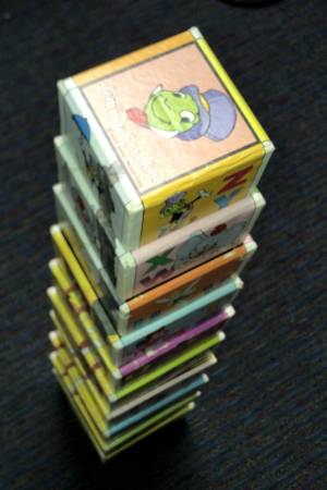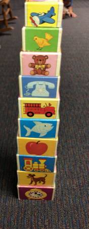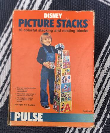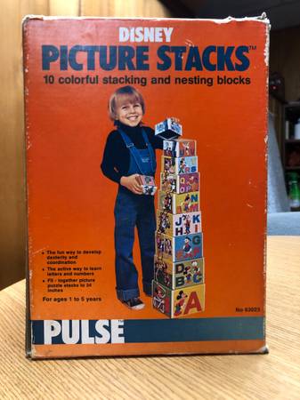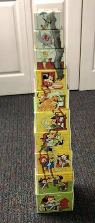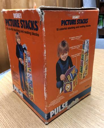 Vintage Walt Disney Picture Stack Blocks Educational Blocks w/ Original 1977 Box 10 Colorful stacking and nesting blocks made in USA 4 sides pictures, letters and numbers All fit together in...