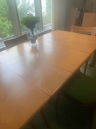 Heywood-Wakefield Table is a beautiful piece of furniture. Table can expand to 95L and 48W and shorten to 59L or 28L. There are 2 18” leafs and 4/chairs. Chairs do show some wear