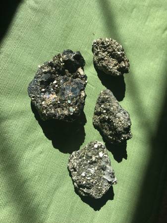 5 Pyrite "Fools Gold" Stones. The largest measures 3" and the others are just slightly smaller. 5 pieces, one is not pictured. 1 large quartz with black flecks 3"x2". Some believe pyrite is a crystal of positive energy and light and it encourages you to face your fears, shields you from negative energy or influences and can also alleviate anxiety, obtained around 1969 and now time for someone else to enjoy them. Price reduced, all for $40. Shipping available. Call/text