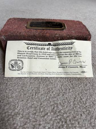 Vintage Hotel Casey, Scranton PA Brick. This brick was taken from the Hotel Casey when the property was demolished in 2001. The Hotel Casey was built in 1910 and was located on the corner of Adams and Lackawanna Ave in downtown Scranton PA. This brick was procured onsite during the demolition of the hotel, is 100% authentic with commemorative plate and certificate of authenticity stating it was used in the construction of the Historical Hotel Casey.
