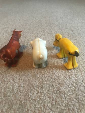 1950s-early 60s, Ramp Walker / "Walkies" plastic toy animals. Made in Hong Kong, likely by Marx. White Pig-$20, Pluto Dog $25, Brown Bull with horns and nose ring.(missing tip on one horn) $20. No cracks and legs move freely. All were played with and in good condition. Priced reduced. Selling separately or all 3 for $50. Shipping available. Call/text
