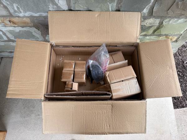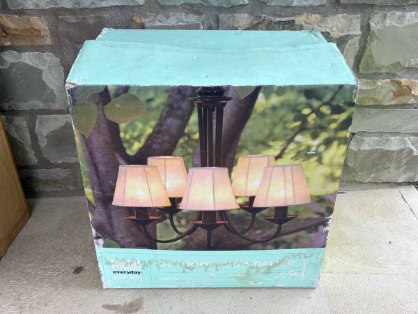Martha Stewart Cambridge Collection outdoor chandelier, $60. Open box, never installed. Bronze metal w/ shades. Box shows some wear, staining.