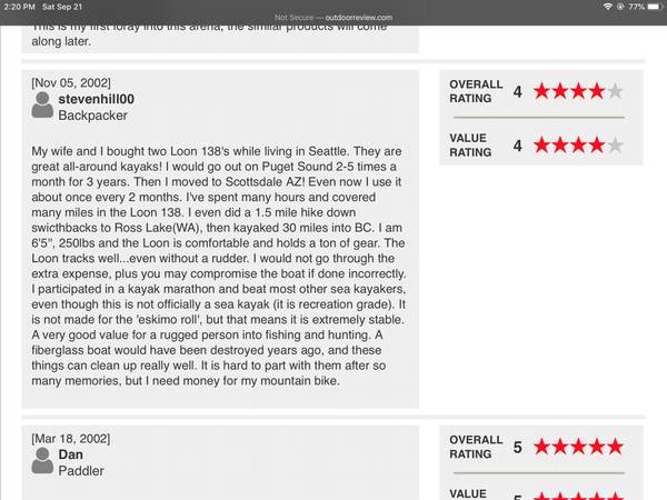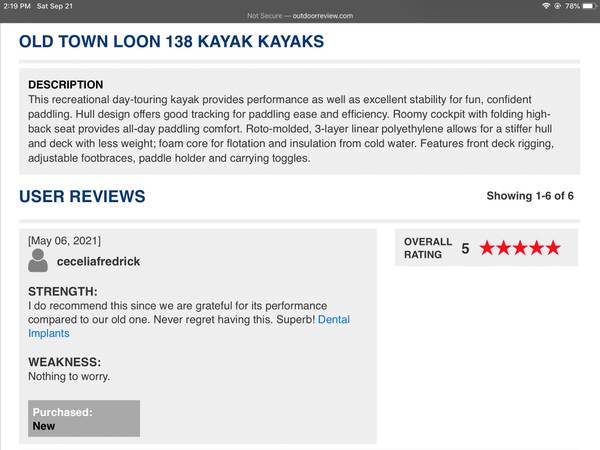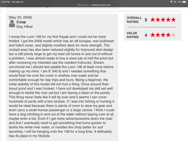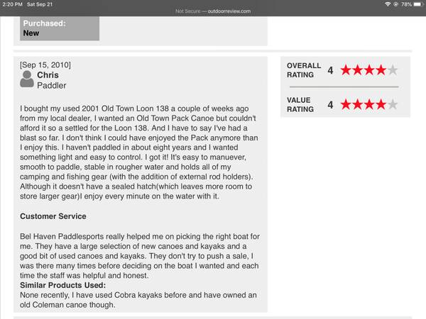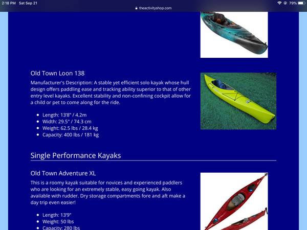 Genuine Old Town quality. Not inferior box store junk. Hardly used condition. Tracks straight. Easy paddling. Comfortable high back, adjustable seat. Roomy cockpit. Check out excellent paddling reviews. Calls receive fastest response. Delivery available.