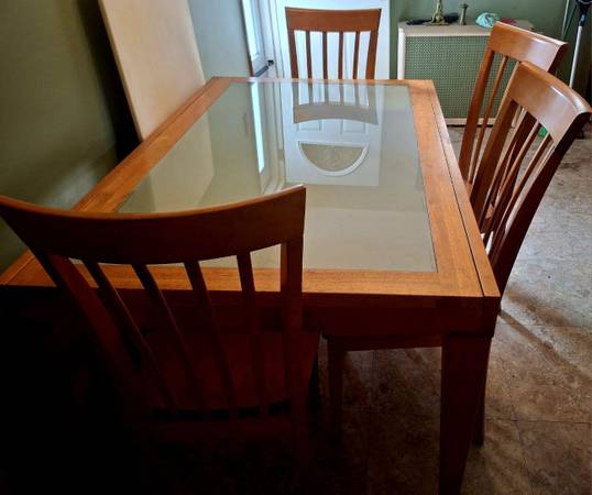 38x60 Glass insert table with 4 chairs.Nice condition.Cash only,you pick up.$125 no trades. There is an extra leaf to extend table.