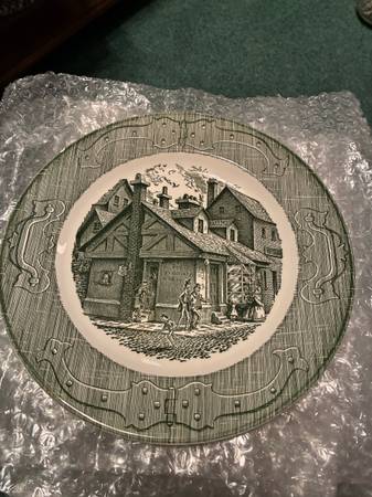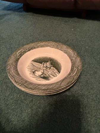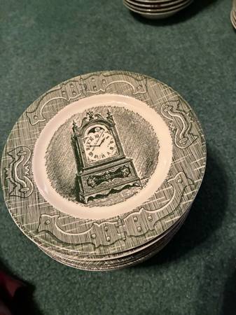 Old Curiosity Shop (green) Made by Royal Theme: Charles Pickens Manufactured in 1950 Mid 20th century era (1951-1969) *20 dinner plates 10 1/8” *18 flat cups 2” *20 saucers 6 1/8” *sugar bowl &...