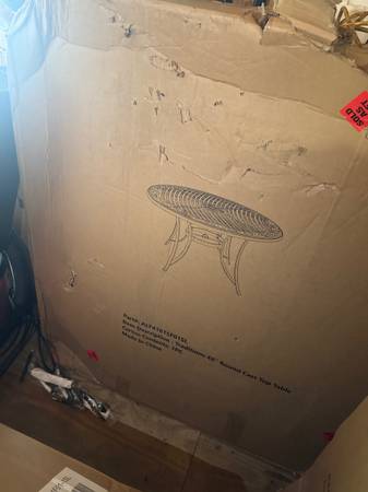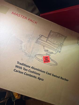New in box set for patio 4 swivel chairs with tan cushions and 48” round cast top table!