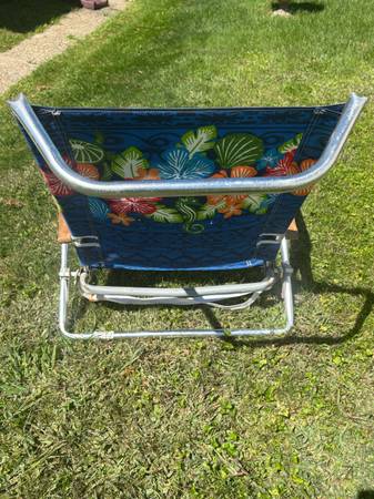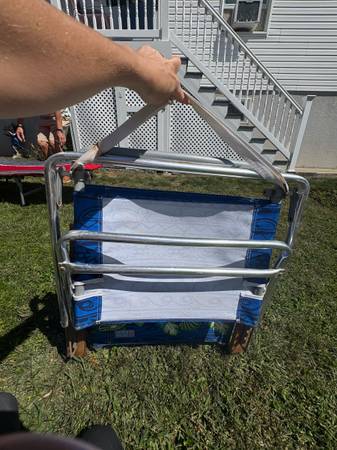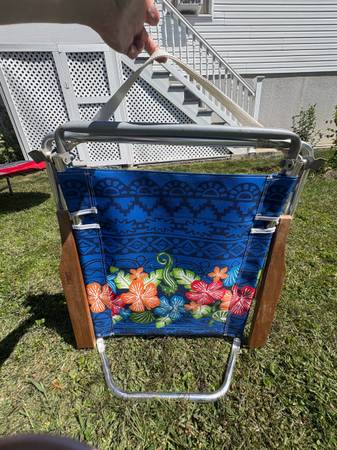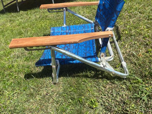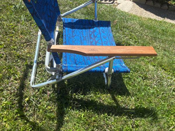 Rio beach aluminum folding chair with teak armrests and carrying strap - Chair is in good, pre-owned, used, working condition. Please see pictures.