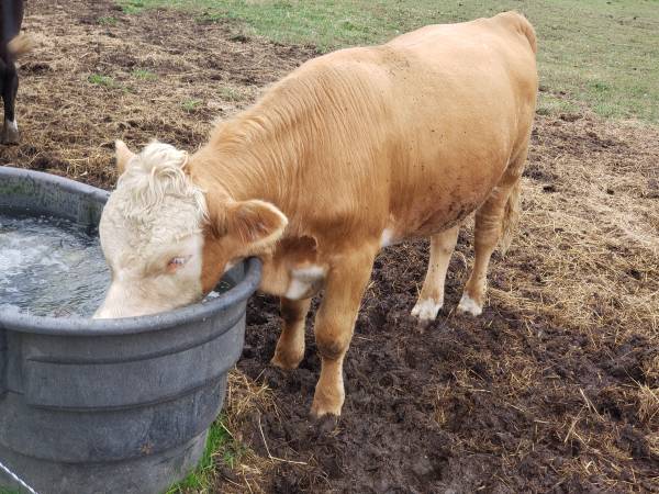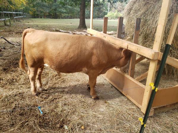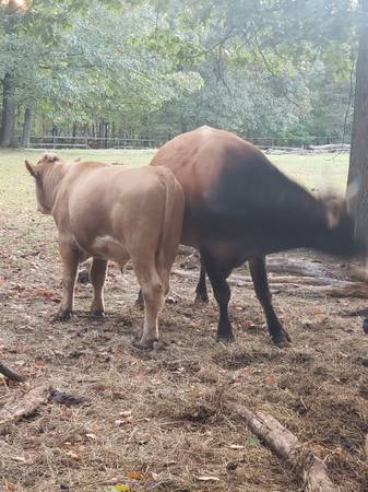Mini hereford bull, born February 2024. He keeps stealing milk from the cow that nursed him no matter how long they were separated, only cow he does that with, otherwise I'd keep him. Electric fence trained and calm disposition. Was partially bottle fed and halter training until kids lost interest. Approximately 38" tall. Jersey next to him is not the sire, just for size comparison. Delivery available for additional cost.
