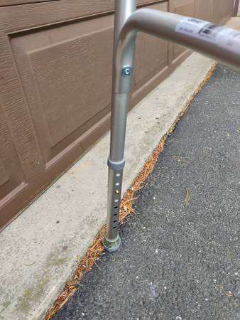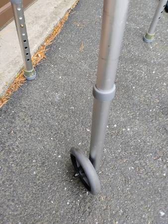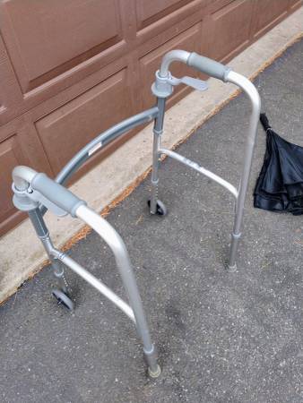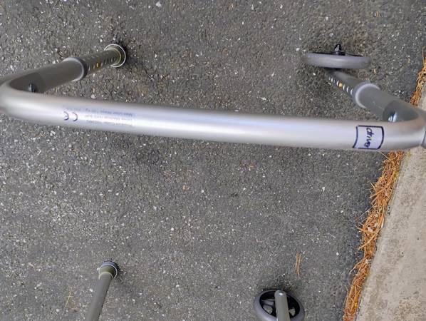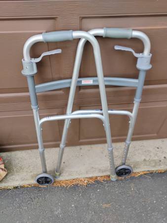 Drive aluminum foldable walker with adjustable height and wheels on the front. Like new and works as it should.