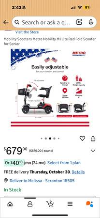 I bought this scooter for over $600 on Amazon because I was recovering from pulmonary embolisms and had severe shortness of breath and needed it to get to and from appointments because I could not handle walking until I fully recovered. It was used less than 20 times. Battery and charger works perfectly. It has fast and slow settings. It has a 320lb weight limit and goes 20 miles per charge. It has a few scuffs on it from my husband putting it in and out of the trunk, but other than that, it works perfectly and charges perfectly. It folds flat and the basket comes off for transport.