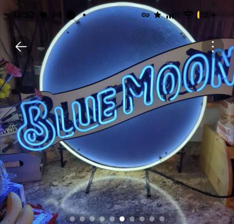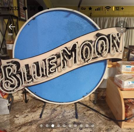 Blue Moon Beer Neon Sign. There is an On/Off pull string. Can be hung or stands on it's own. Very beautiful piece. 29"wide x 27" tall x 6" deep. Plugs in. LOCAL ONLY DUE TO FRAGILITY