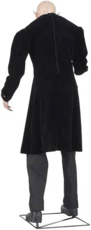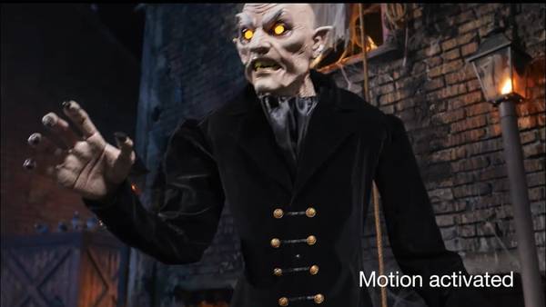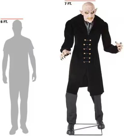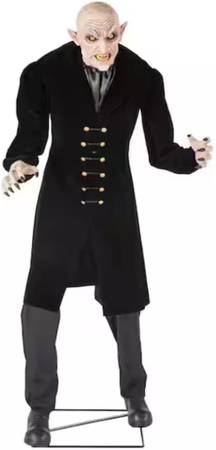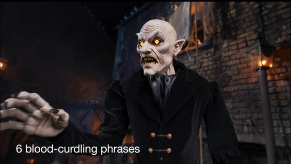 The Home Depot Home Accents Holiday 7 ft. Animated LED Victorian Vampire has LED glowing eyes, animated head, mouth and body movement, speaks 6 different skin-crawling phrases and is motion sensor activated. This vampire will hunt down his next victim. This was only sold at Home Depot for Halloween 2024 and is not sold there anymore.