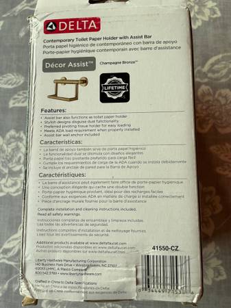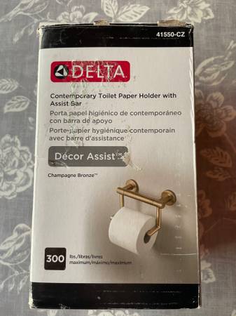 New in box, Delta 41550-CZ combination toilet paper holder and assist (grab) bar in champagne bronze. Meets ADA load requirements when properly installed. Wall anchor included. 300 lb. capacity. Will meet at the Community Center parking lot in Pleasant Mount, PA