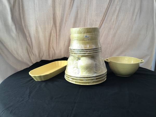 Discontinued. New never used. 16 piece dish set PLUS 16 inch serving platter and 2 quart block bowl with handles all and impossible to find butter cream! Serving platter and block bowl used once for a party.