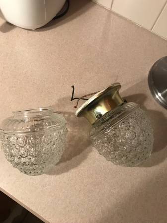 Gold color metal lighting fixture base approx 5" wide with patterned glass shade. Use as ceiling light fixture indoor or covered outdoor area. One 2 wire base with glass and a spare glass. Accepts standard base bulb. Screws and wire nuts not included. Good condition. Price reduced. Call/text