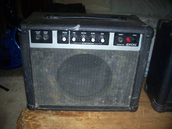 Excel EXB 15 bass guitar practice amp.15 watt w/8" Celestion speaker.Black & silver face front panel has two 1/4" input jacks(CD/tape input & guitar input).5 original knobs w/volume,low,low mid,hi mid & high.Phones 1/4" out.Back panel has 1/4" external spk output.Black cloth spk grill.Celestion 8" Super 8 spk(G8A15 Ipswitch England).HD black tolex has age wear.6 cosmetic w/some dust,scuff & stains.Works fine.Made in China late 80s-90s. 25.00