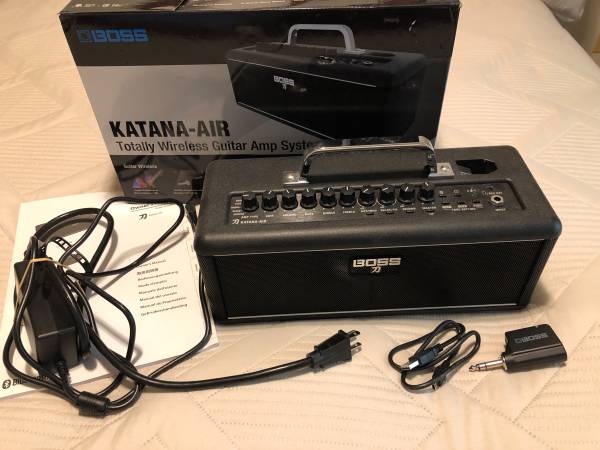 Boss Katana Air totally wireless modeling amp with receiver and bluetooth, Case be used wireless or with cable. Solid build and will get any sound you want. Powered by plugging in. Cash, No Trades...