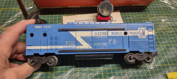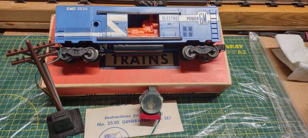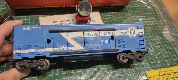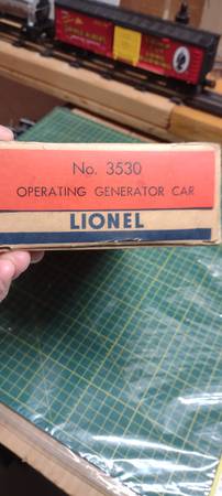 LIONEL 3530 POST WAR OPERATING GENERATOR CAR IN VG CONDITION OB. Made from 1956 to 1958. Complete with reproduced instruictions. This is an Original Post War Version as this was reproduced in 1997 & the 2000's. Box is original & is in good condition and has all it's tabs.