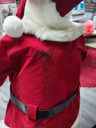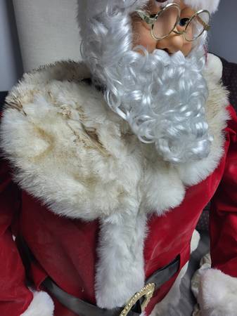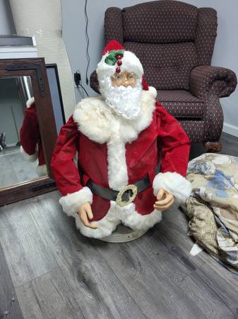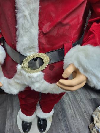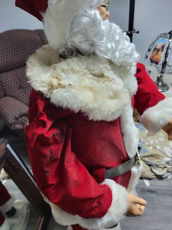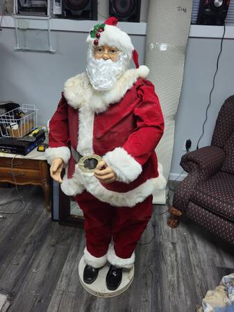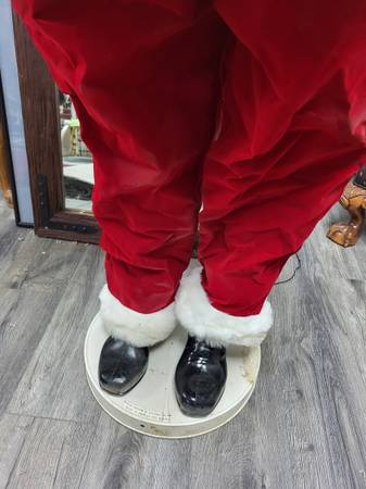 5 foot when raised, for indoor use, runs on electric. Dances and sings Jingle Bells. From 2004 PAC LTD.Works great but Santa suit is in poor condition, not sure if it can be cleaned.