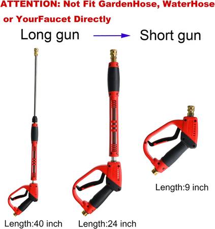 Replacement pressure washer gun has three lengths to use. Three Length: 40 inch, 25 inch, 8.8 inch.